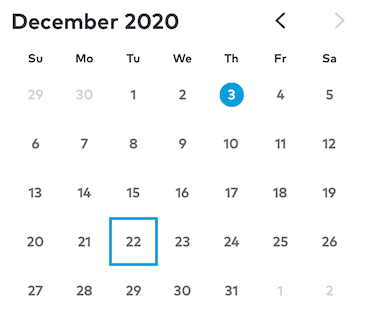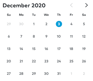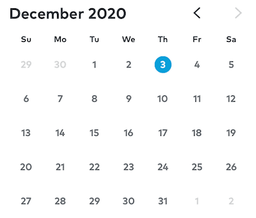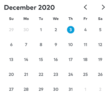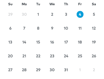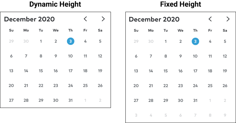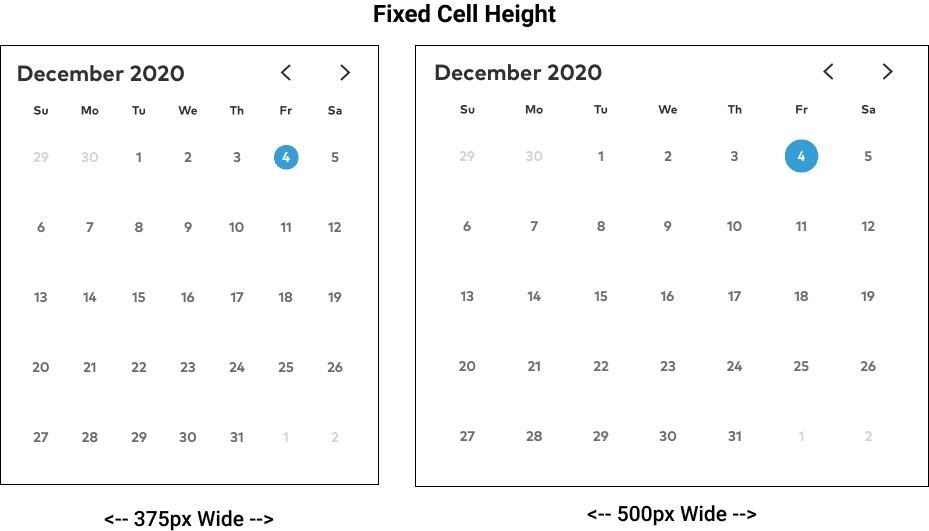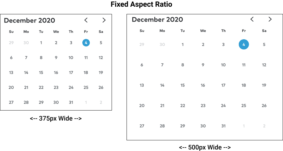 CalendarPicker cells also have configurable heights, either fixed or aspectRatio. Fixed height cells are configured with a set constant height that they will conform to regardless CalendarPicker's width. In contrast, a cell with an aspectRatio height is configured with a fixed aspect ratio, which the CalendarPicker uses (along with its own width) to compute each cell's height.