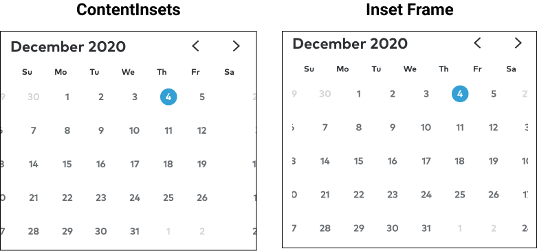 The following image shows two otherwise visually identical calendars in the middle of a scroll between months. Here, the calendar on the left has a full width frame but it's left and right contentInset is set to 16px. The calendar on the right has a frame that has been inset 16px from its parent. Notice that, in the image on the right, the date cells clip out of frame before they reach the edge of the screen.