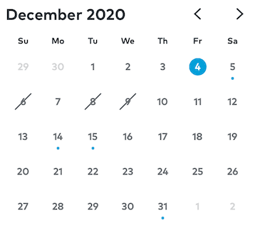 The CalendarPicker can be used to both display availability information (by marking dates with a dot or a slash mark), and solicit date selection(s) from the user. It can be configured to display any possible date range, and can be made interactive by registering for its delegate callback methods.