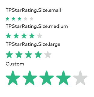 /// Three standard sizes:/// small - 12/// medium - 18/// large - 24TPStarRating(rating: .constant(4)).tpStarRatingSize(TPStarRatingSize.small)// Configurable for any sizeTPStarRating(rating: .constant(4)).tpStarRatingSize(48.0)